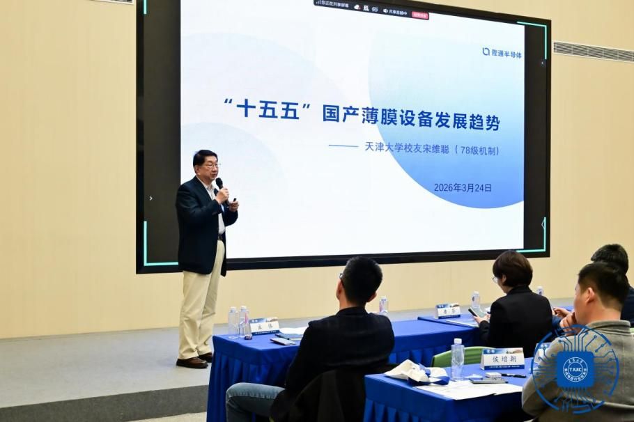 行业校友会副会长、陛通半导体董事长宋维聪(78级校友)作《“十五五”国产薄膜装备的发展趋势》主题报告。他表示,薄膜沉积等核心装备国产化进程持续加快,校友企业正深耕核心装备研发,为国产半导体装备自主可控注入力量。