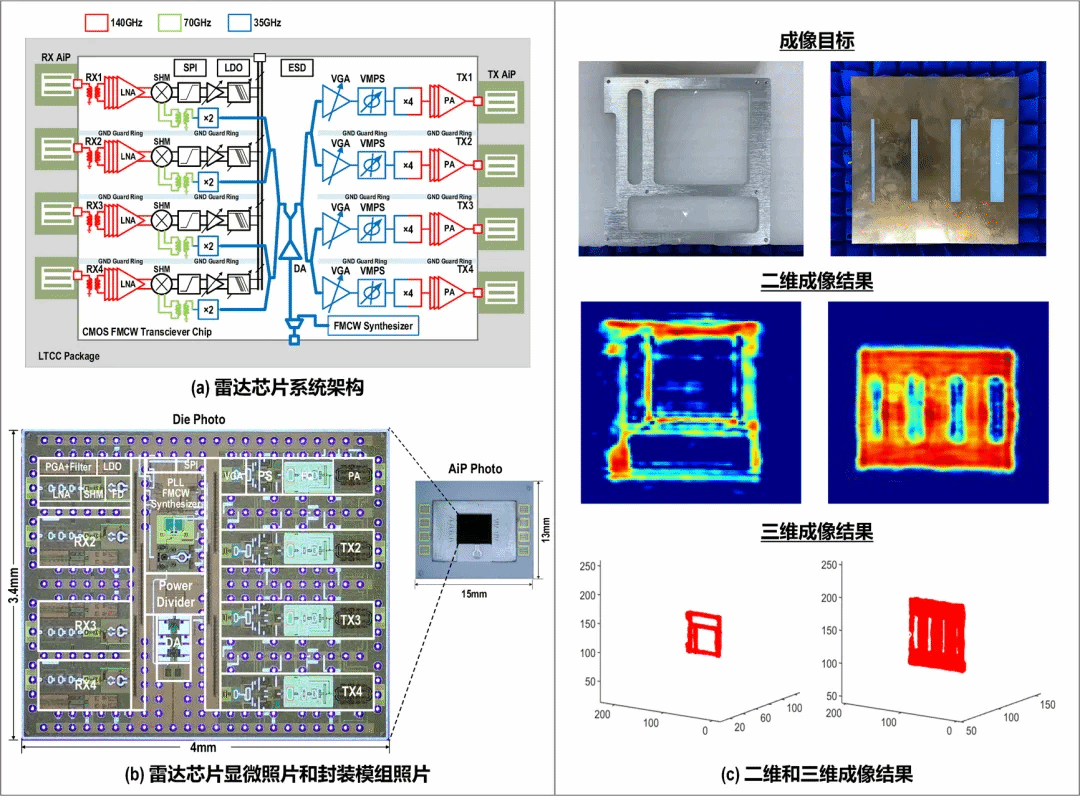 芯片系统架构、芯片和封装模组照片、成像结果。